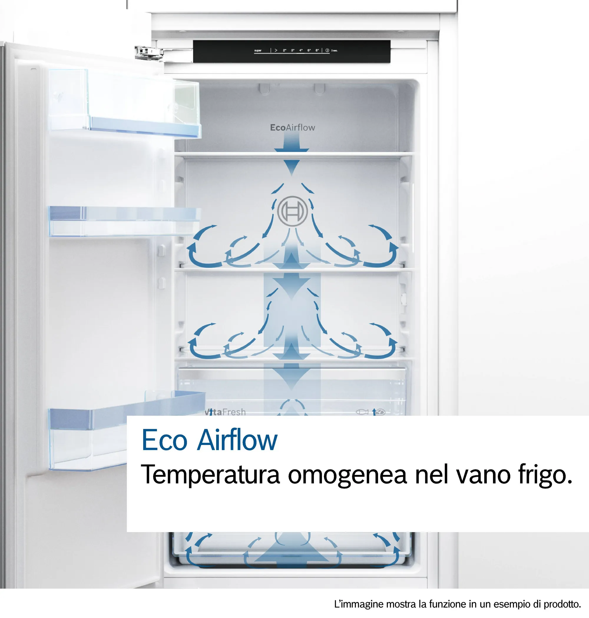 Pensato per l’incasso in cucine moderne, si distingue per il suo funzionamento estremamente silenzioso (solo 34 dB), l’illuminazione LED e la presenza del pratico cassetto MultiBox XXL, perfetto per frutta e verdura. La distribuzione omogenea del freddo è assicurata dal sistema EcoAirflow, che mantiene costanti temperatura e umidità per una conservazione ottimale degli alimenti.